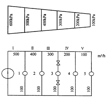 408、网路正常工况时水压图和各热用户流量如下图,则用户3之后的网路总阻抗为( )Pa/(m³/h)²。