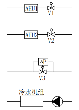 1108、某建筑的集中空调系统,末端均采用室内温度控制表冷器回水管上的两通电动阀(正常工作),空调冷水系统采用压差旁通控制一级泵定流通系统,全部系统均能有效地进行自动控制,如图所示。问:当末端AHU1所负担的房间况负荷由小变大、末端AHU2所负担的房间况负荷不变时,各控制阀的开度变化情况,正确的是(供回水温度保持不变)( )。
