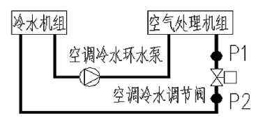 1112、下图所示空调系统,调节空气处理机组的空调冷水调节阀开度以维持设定的送风温度,调节空调冷水循环泵转速以维持P1,P2两点之间压差不变。假设水泵允许在0Hz到工频之间变频。对运行调节不构成影响的因素是( )。