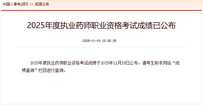 2025年度执业药师职业资格考试成绩于2025年11月19日公布,请考生到中国人事考试网“成绩查询”栏目进行查询。